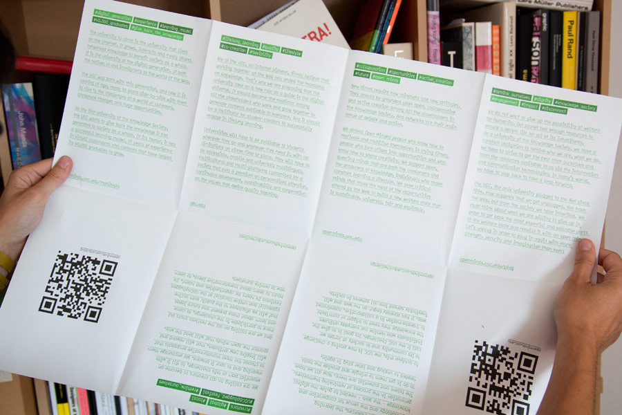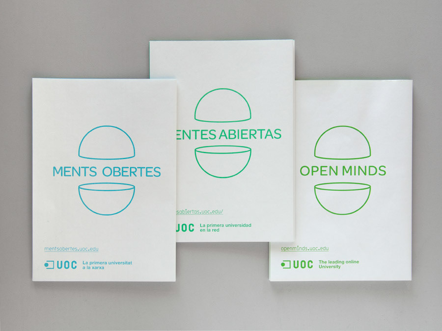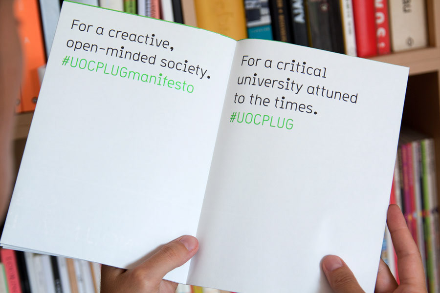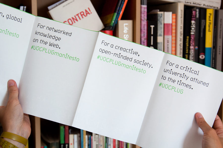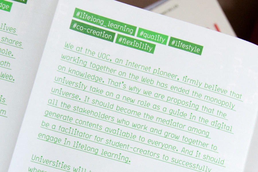 The UOC university celebrates the 25th anniversary summing up its identity in a manifesto. To balance the institutional voice, on the back we find a compilation of tweets revealing the students’ experience and point of view.